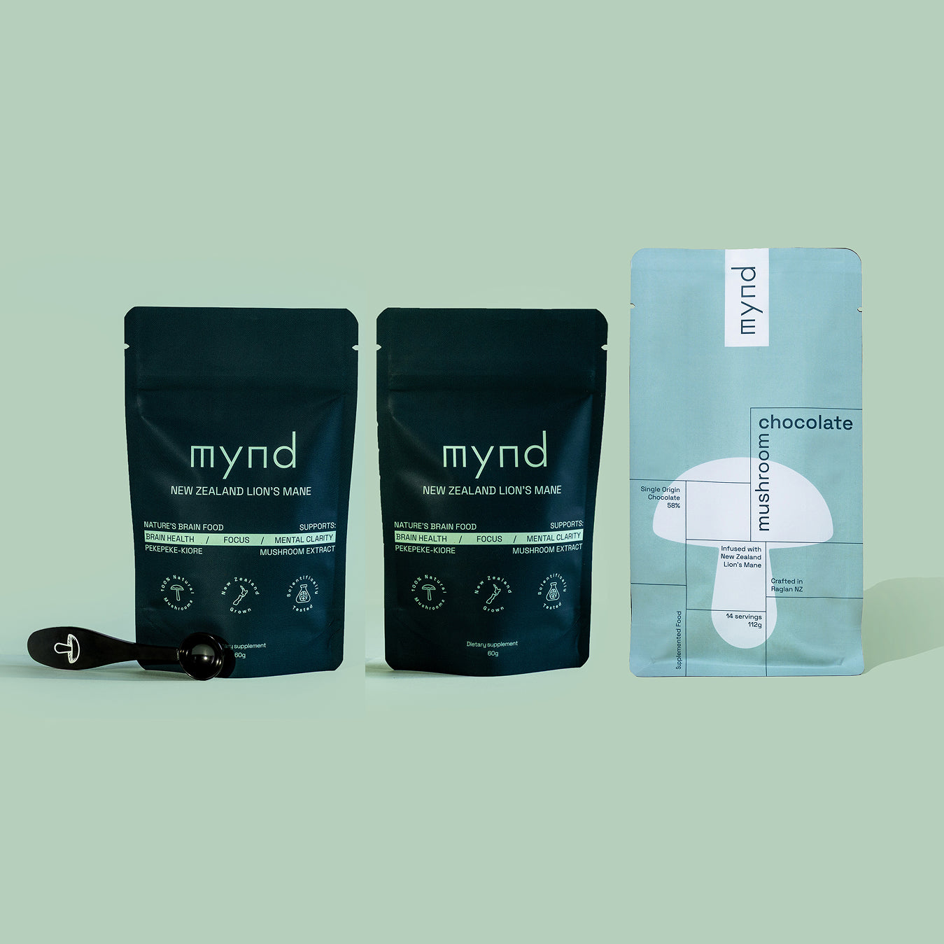 - Mynd Chocolate (28 pieces) — dark 58% chocolate with infused NZ Lion’s Mane.