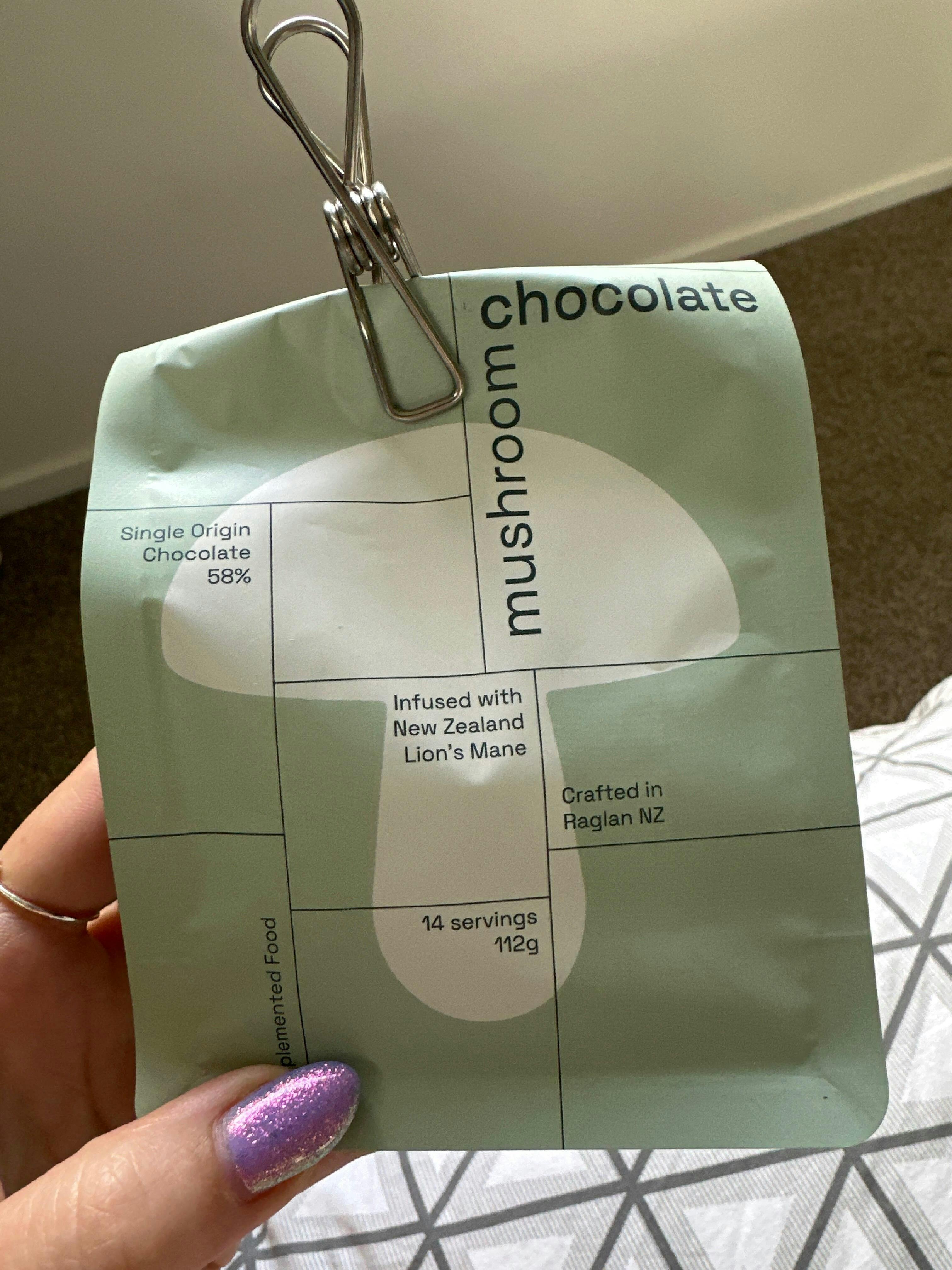 Each bag contains 28 individual mushroom-shaped chocolates. Every two chocolates deliver one full serving (1g) of New Zealand Lion’s Mane.
